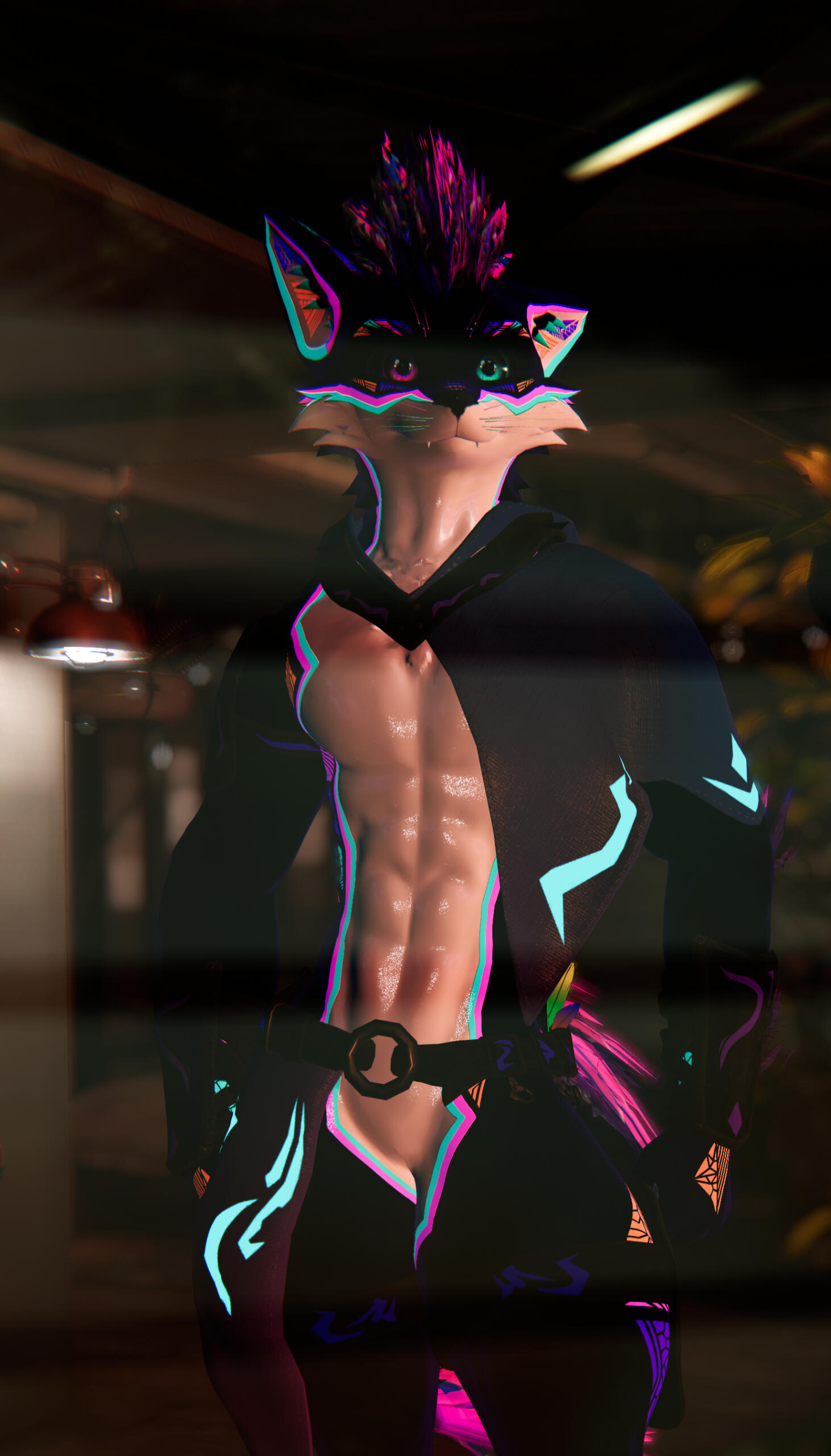 With midnight fur kissed by vibrant orange and green highlights, Nightingale is a vision of alluring contradictions. His deep green eyes hold a warmth that could melt glaciers, promising comfort and intimacy. Yet those depths also hint at a guarded heart, bearing the scars of past betrayals. His movements are languid and graceful, an invitation to touch and closeness, but a subtle tension lingers beneath the surface, betraying his fear of vulnerability.While Nightingale may seem aloof at first, those who earn his trust discover a fiercely loyal companion with a depth of love that runs deep. His touch is gentle yet possessive, his kisses slow and lingering. He cherishes intimacy, finding solace in the shared silence as much as in whispered words of affection. Despite the walls he's built, there's a flicker of hope within him, a yearning for someone who will see beyond the scars and love him unconditionally.His striking appearance is a reflection of his complex nature: black fur shot through with vibrant orange and green highlights, a testament to both the fiery passion and verdant vulnerability that reside within him. He is stunningly handsome, his features sharp yet undeniably alluring. But true beauty lies in his soul, a wounded spirit longing for redemption and the chance to love and be loved again.